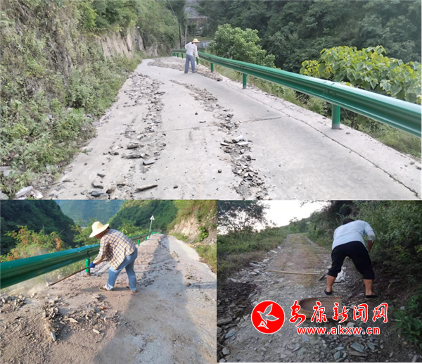 6月下旬,一場(chǎng)暴雨來(lái)襲,緩解旱情的同時(shí),又將三組陽(yáng)在梁(小地名)的通組主干道沖擊損毀,這不僅使三組村民出行困難,更是阻斷了金銀花外銷的交通道路。得知這一情況后,市司法局駐村工作隊(duì)和村“兩委”立即組織公益崗對(duì)道路進(jìn)行自救修復(fù)。