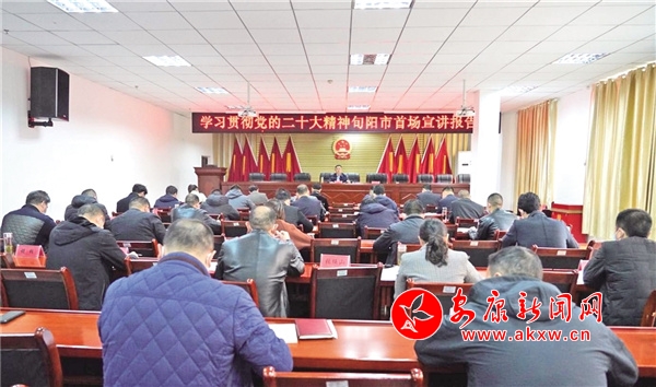 黨的二十大為新時代新征程黨和國家事業(yè)發(fā)展、實現(xiàn)第二個百年奮斗目標擘畫了發(fā)展藍圖、規(guī)劃了實踐路徑、作出了戰(zhàn)略部署。旬陽市委第一時間召開會議、印發(fā)通知,要求全市各級黨組織和廣大黨員把學習宣傳貫徹黨的二十大精神作為當前和今后一個時期的重大政治任務,迅速興起學習熱潮。去年10月24日以來,市委先后召開6次會議集中學習黨的二十大精神,10月28日,全市黨員干部學習黨的二十大精神集中培訓會順利召開,11月22日,旬陽市黨的二十大精神宣講工作全面啟動,市委書記陳紅星在城關鎮(zhèn)開展黨的二十大精神首場宣講,以上率下做好宣講“頭等大事”。市委書記的帶頭宣講宛如一聲“發(fā)令槍”,引領全市宣講不斷走深走實。隨后,其他市級領導、各鎮(zhèn)黨委書記和市直部門主要負責同志,均深入基層或在分管領域、本單位本系統(tǒng)開展宣講90余場次,切實推動黨的二十大精神進黨政機關、進企事業(yè)單位、進城鄉(xiāng)社區(qū)、進校園課堂、進各類新經(jīng)濟組織和新社會組織。