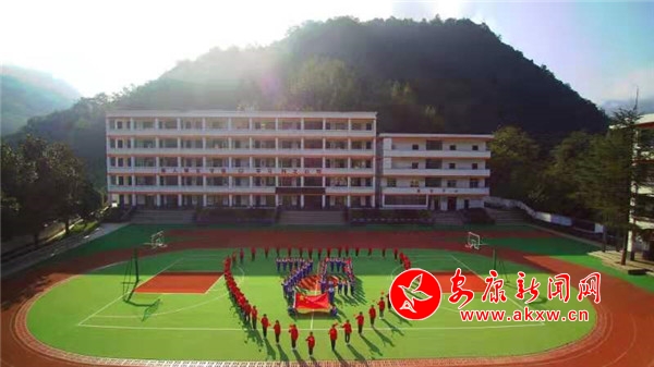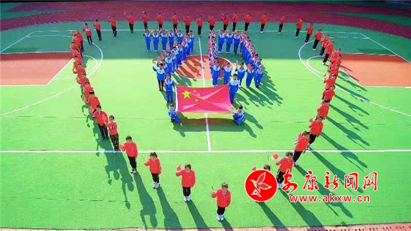 幾十名身穿藍色班服的學生在操場正中央排成數(shù)字“70",在數(shù)字正前面,四名同學展開國旗,然后,數(shù)十名身穿紅色班服的學生在外圍圍成"心"形。"70",象征著70周年,"心"型, 寓含著孩子們對偉大祖國的熱愛。整個造型寓意深刻,活動表現(xiàn)形式新穎獨特,令人耳目一新。