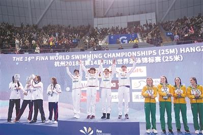 今晚,杭州2018年第14屆FINA世界游泳錦標(biāo)賽(25米)決出了7個(gè)項(xiàng)目的金牌,其中,李冰潔、楊,u、張雨涵、王簡(jiǎn)嘉禾組成的中國(guó)女隊(duì)以7分34秒08的成績(jī)打破亞洲紀(jì)錄,力壓美國(guó)隊(duì)和澳大利亞隊(duì)奪得了女子4×200米自由泳接力的金牌,這是中國(guó)游泳隊(duì)在本屆短池世錦賽上的第3枚金牌,也是王簡(jiǎn)嘉禾個(gè)人第2枚金牌。